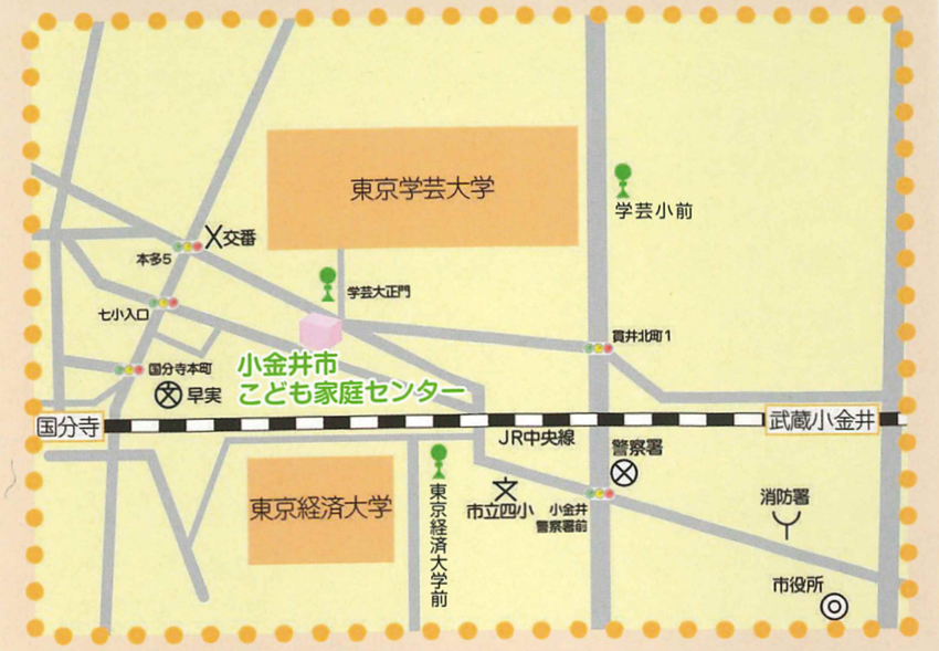 北口から 京王バス:武蔵小金井駅北口行 「学芸大正門前」下車徒歩3分 徒歩:北口から「七小入口」の交差点を右折しセンター裏側から入館道 (保健センター通り)が近い。こどもと歩いておよそ15~20分